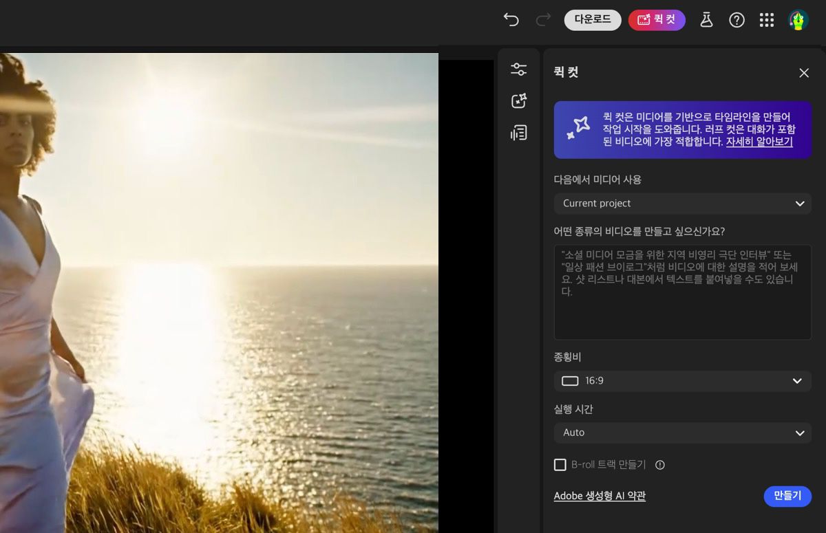 이 기능은 Firefly 비디오 편집기의 새 프로젝트와 기존 프로젝트에서 모두 작동합니다. 퀵 컷을 생성하려면 다음이 필요합니다.
