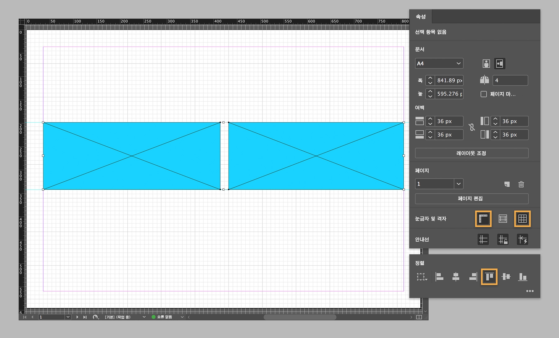 눈금자에서 안내선을 드래그하거나 문서 격자를 선택하면 페이지에 개체를 손쉽게 정렬할 수 있습니다. 속성 패널에서 정렬 설정을 클릭하면 개체가 자동으로 정렬됩니다.