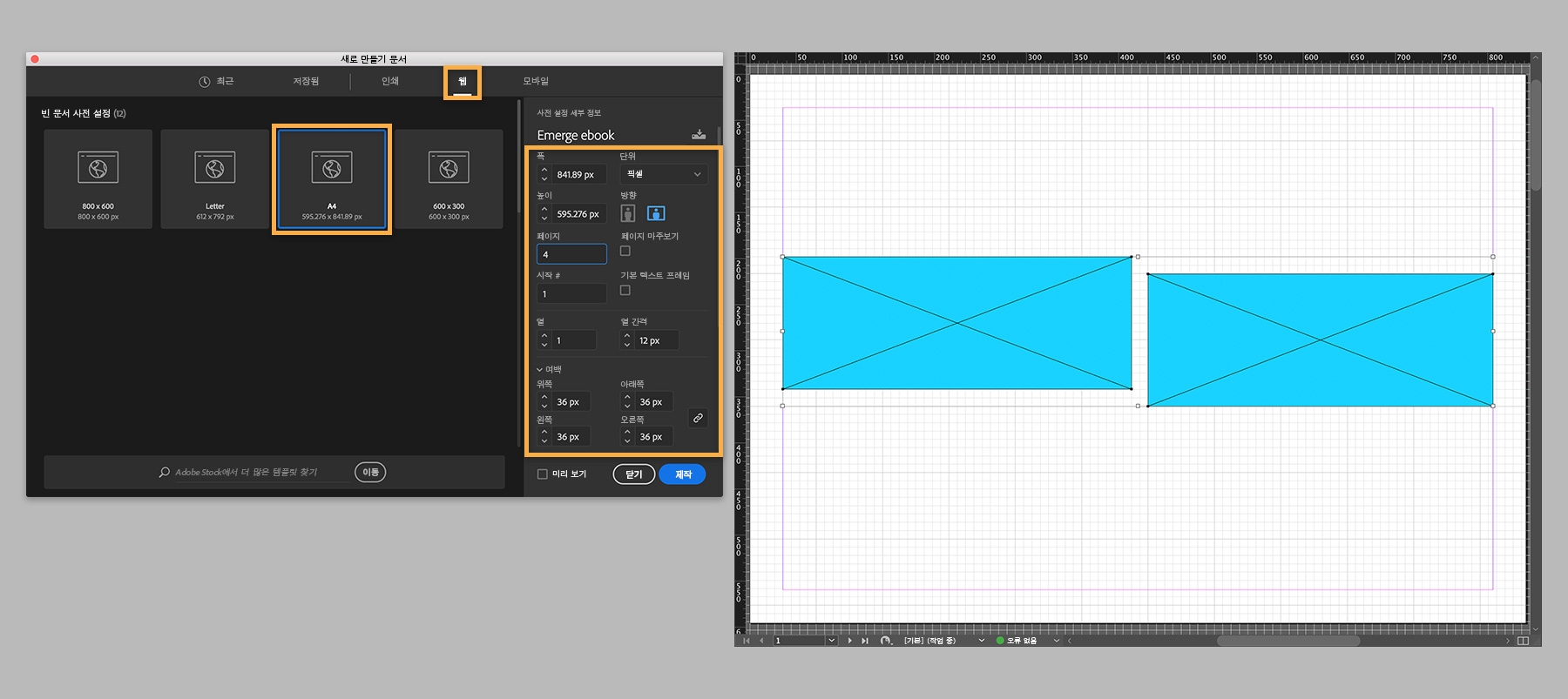 새 문서를 만들고 페이지 크기, 방향, 페이지 수 및 여백을 지정합니다. 이 실습에서는 먼저 A4 사전 설정을 선택하고 페이지 마주보기를 선택 해제했습니다.