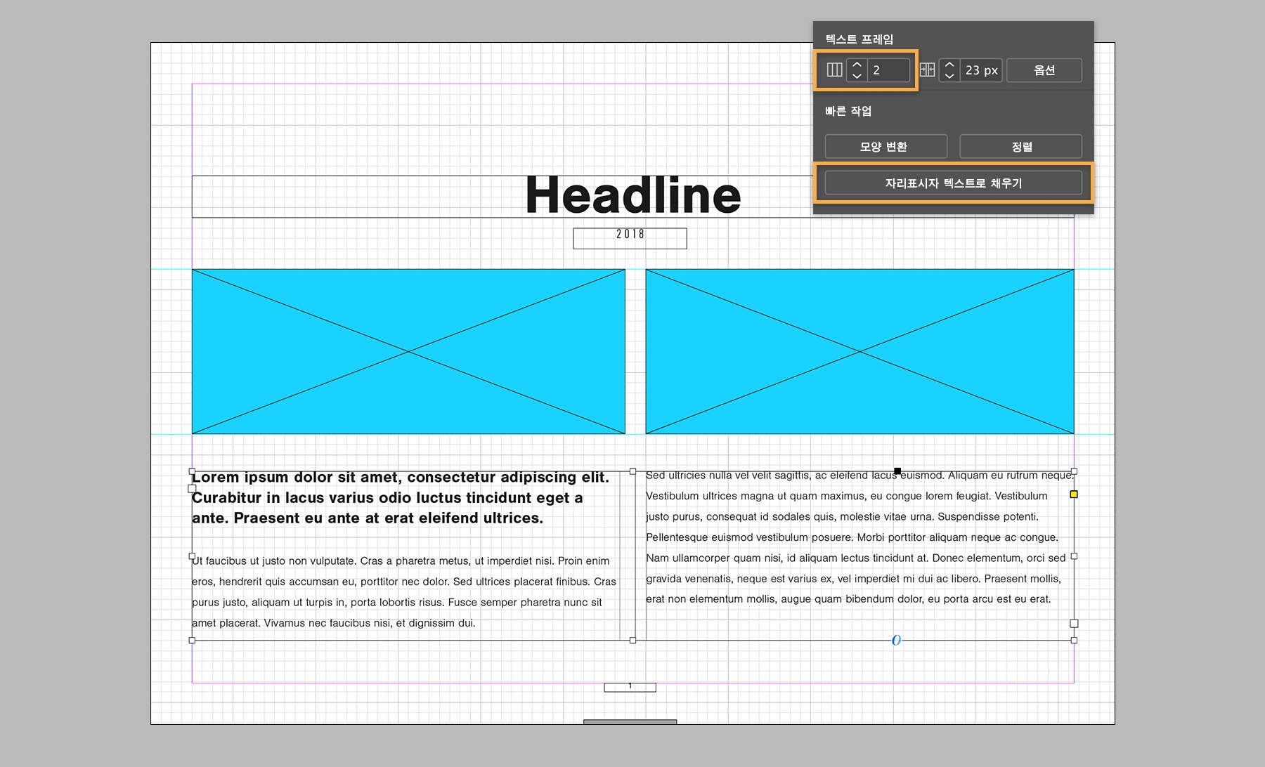 문자 툴을 사용하여 텍스트 프레임을 만듭니다. 텍스트 열을 만들려면 텍스트 프레임을 추가하고 선택 툴로 전환합니다. 속성 패널의 텍스트 프레임 섹션에서 열 수를 입력합니다. 더미 텍스트를 추가하려면 자리표시자 텍스트로 채우기를 클릭한 다음 속성 패널에서 서식을 지정합니다.