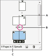 A. 문서 창 아래쪽에 있는 페이지 상자의 섹션 접두어 B. 페이지 자체의 섹션 표시자 및 접두어