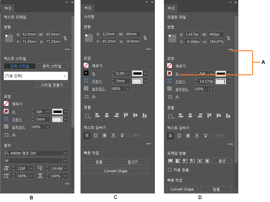 - 변형 및 모양 컨트롤:폭, 높이, 칠, 선, 불투명도 등.