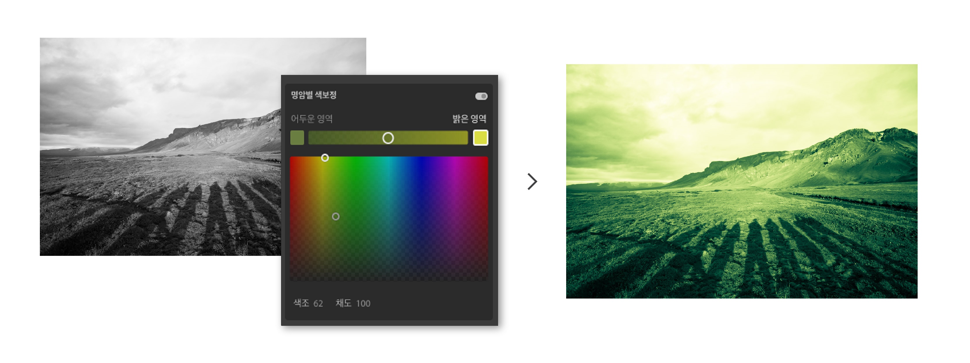 - 노출 전체 이미지 명도를 설정합니다. 노출 로컬 조정을 적용하면 기존의 닷지 및 번과 유사한 결과를 얻을 수 있습니다.