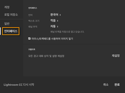 - 현재 설정을 적용하려면 다시 시작을 선택하세요. Lightroom이 종료되고 업데이트된 설정이 적용된 상태로 다시 실행됩니다.