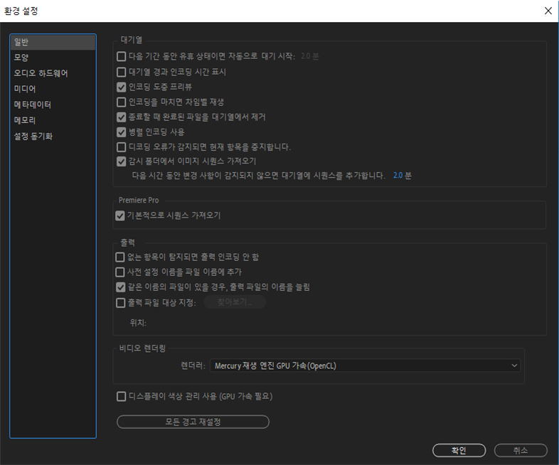 Media Encoder에서 대기열 동작, 출력 설정 및 비디오 렌더링에 대한 일반 환경을 설정합니다.