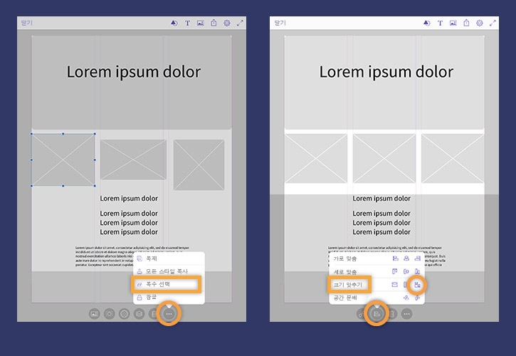 이미지 자리 표시자를 눌러 선택한 다음 화면 하단에 있는 추가 옵션 아이콘을 누르고 복수 선택 을 선택합니다. 레이아웃에서 다른 두 개의 이미지 자리 표시자를 눌러 선택 항목에 추가하고 완료를 누릅니다.