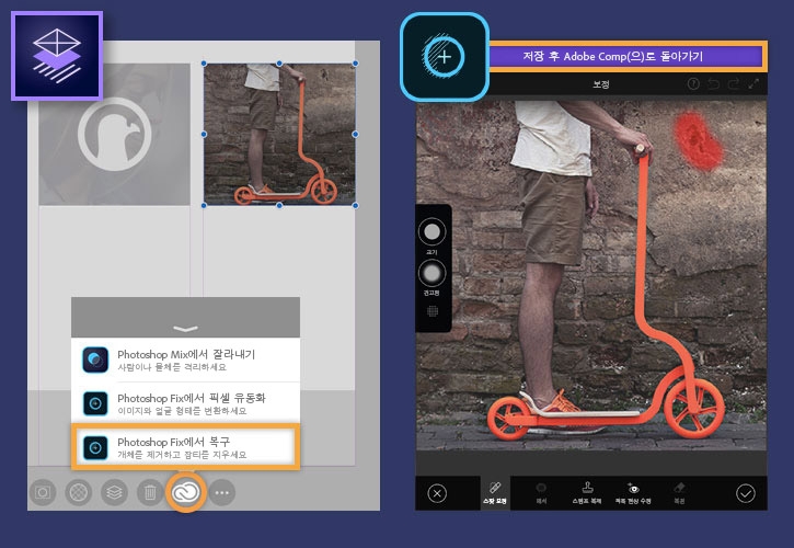 Comp CC는 Adobe CreativeSync를 통해 Photoshop Mix 및 Photoshop Fix와 같은 다른 모바일 앱과 매끄럽게 연동되므로 Comp 레이아웃에서 즉시 업데이트되는 합성 이미지를 수정하거나 만들 수 있습니다.