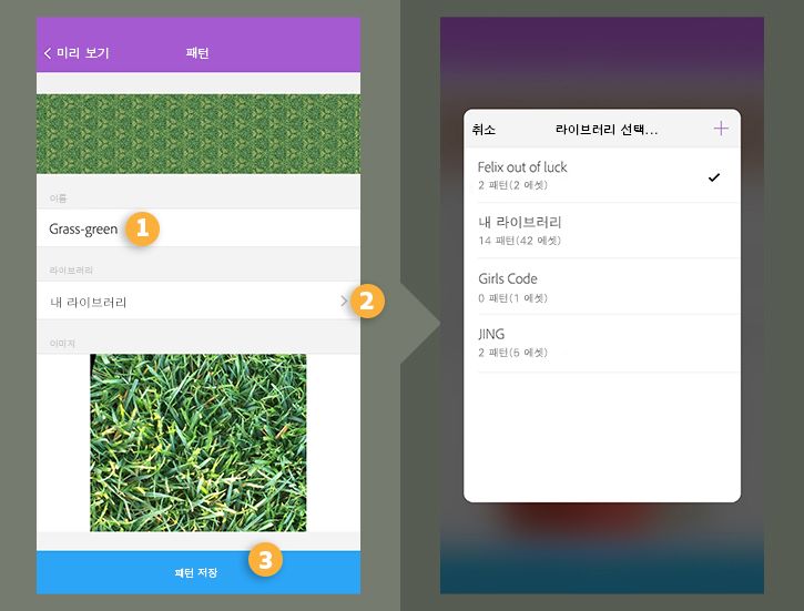 패턴의 이름을 지정합니다(1). 해당 Creative Cloud 라이브러리(2)를 선택한 다음 패턴 저장(3)을 눌러 선택한 라이브러리에 저장합니다.