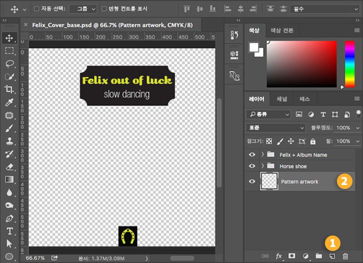 창 > 레이어를 선택하여 레이어 패널을 엽니다. 레이어 아이콘(1)을 클릭하여 새 레이어를 추가하고 다른 레이어 아래로 드래그한 다음(2) 이름을 Pattern artwork이라고 입력합니다.