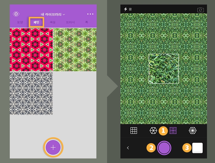 각 4개의 패턴 스타일(1)을 눌러 원하는 패턴을 결정합니다. 두 손가락으로 집고 벌려 확대하여 패턴의 세부 사항을 조정합니다. 선택한 패턴을 만들려면 캡처 버튼(2)을 누릅니다.