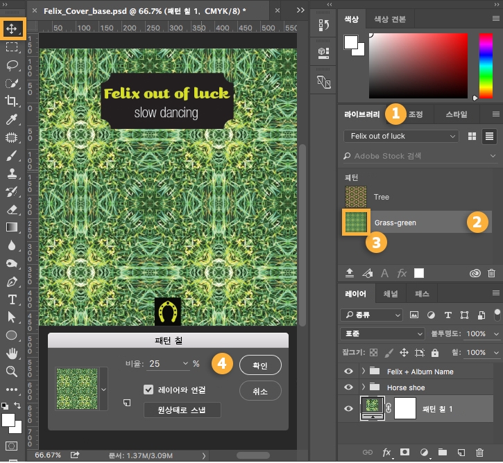 왼쪽에 있는 툴바에서 이동 툴을 선택하고 Pattern artwork 레이어가 선택되어 있는지 확인합니다. 그런 다음 라이브러리에서 원하는 패턴을 두 번 클릭하여(3) 엽니다. 대화 상자가 표시되면 패턴의 비율을 조정하고 선택한 레이어와 연결합니다(4). 원하는 비율 값을 조정하고 확인을 클릭합니다.