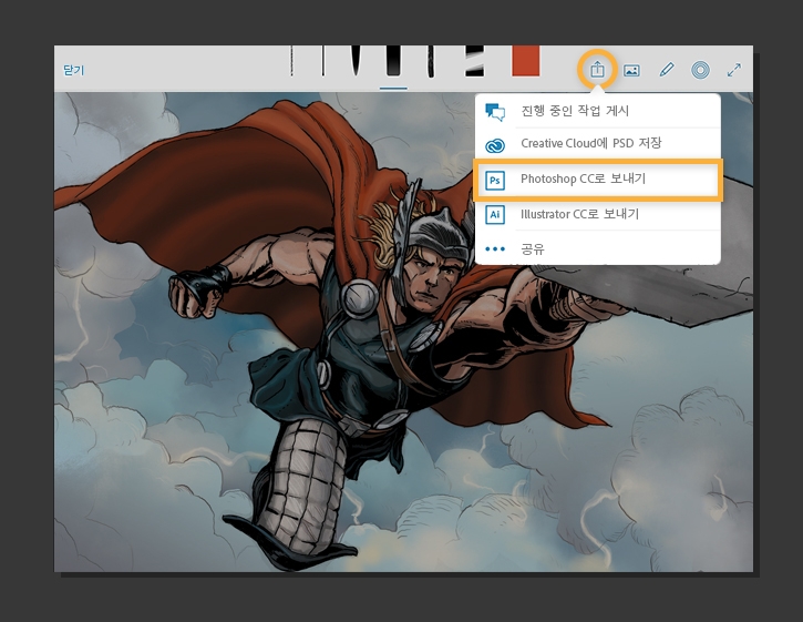 보내기 아이콘을 누른 다음 Photoshop으로 보내기를 선택하면 잠시 후 이미지가 데스크탑에 표시됩니다.