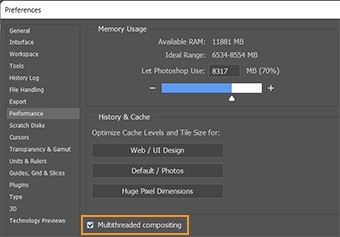 Photoshop 23.3의 2022년 4월 릴리스에서는 멀티 스레드 및 GPU 합성 옵션을 사용하여 작업 속도를 높일 수 있습니다. 멀티 스레드 합성을 활성화하려면 환경 설정 > 성능으로 이동한 다음 멀티 스레드 합성 옵션을 활성화합니다. 이 변경 사항을 적용하기 위해 Photoshop을 다시 시작할 필요는 없습니다.