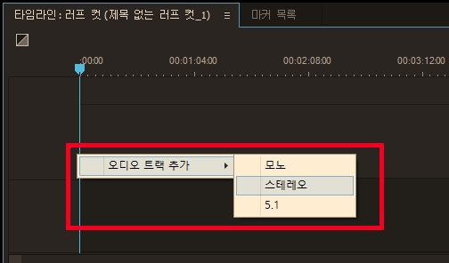 [타임라인]에서 마우스 오른쪽 버튼으로 클릭하고 컨텍스트 메뉴에서 오디오 트랙 추가를 선택합니다.