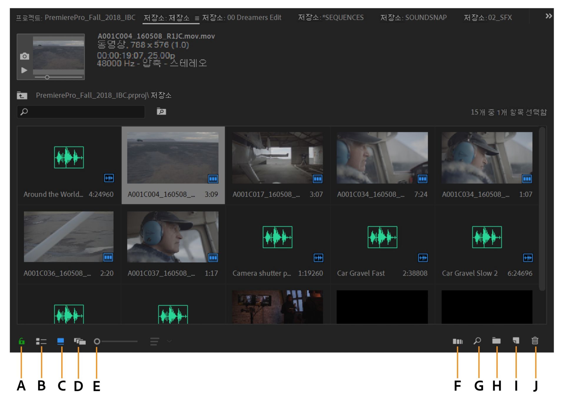 Premiere Pro의 아이콘 보기에는 다음과 같은 기능이 있습니다.