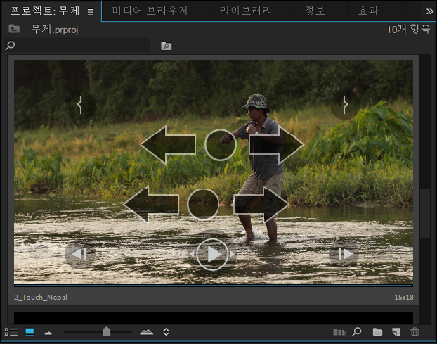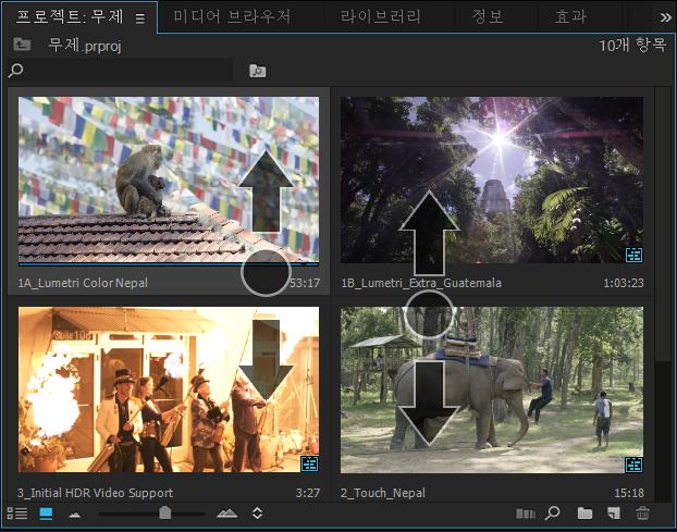 스크롤 제스처와 같은 제스처에 두 손가락을 사용하면 프로젝트패널 아이콘 보기와 프로그램 모니터패널에서 호버 스크러빙과 유사하게 클립과 시퀀스를 앞뒤로 스크러빙할 수 있습니다. 스크러빙 제스처는 축소판/모니터의 폭을 기준으로 지속 시간에서 최대 30분까지 1:1 관계의 클립/시퀀스의 재생 헤드를 이동합니다. 30분의 지속 시간이 추가될 때마다 다른 스크러빙 동작이 필요합니다. 재생 헤드는 각 동작이 끝날 때 중지된 위치에 유지됩니다.