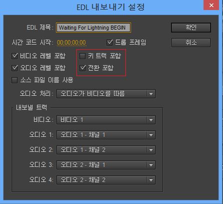 [EDL 내보내기] 대화 상자에는 키 트랙과 전환을 포함하거나 제외하는 데 사용할 수 있는 두 가지 새로운 옵션이 나와 있습니다.