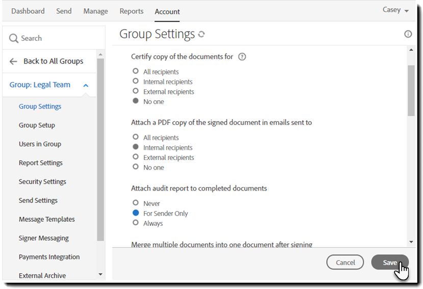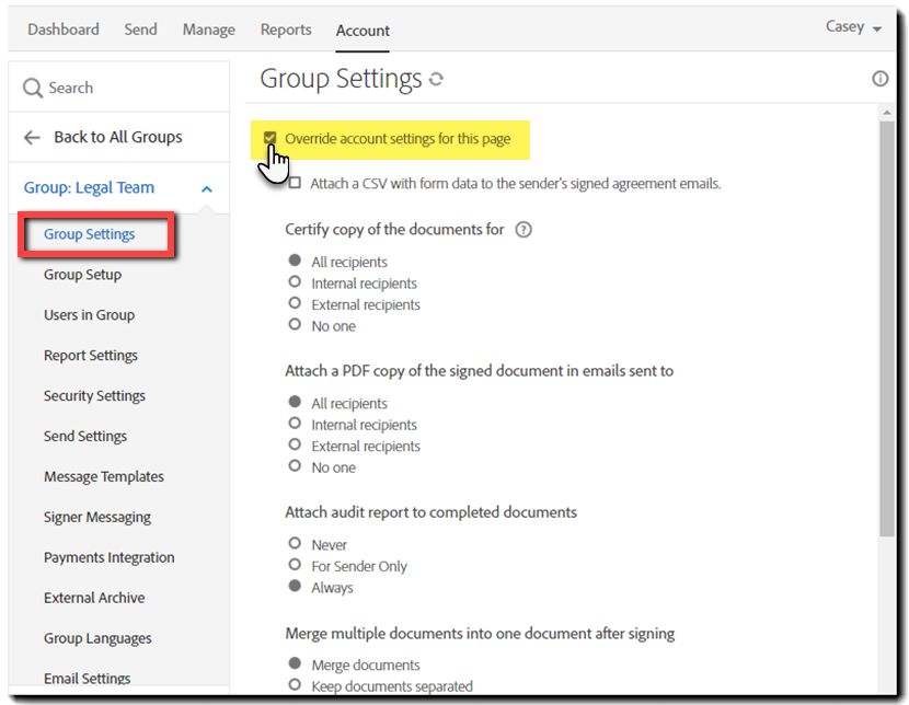 그룹에는 이 그룹에 있는 사용자가 Adobe Sign을 사용하는 방법을 바꿀 수 있는 특정 설정이 있습니다. 이러한 변경 작업은 그룹의 관리자나 계정 관리자만 수행할 수 있습니다.