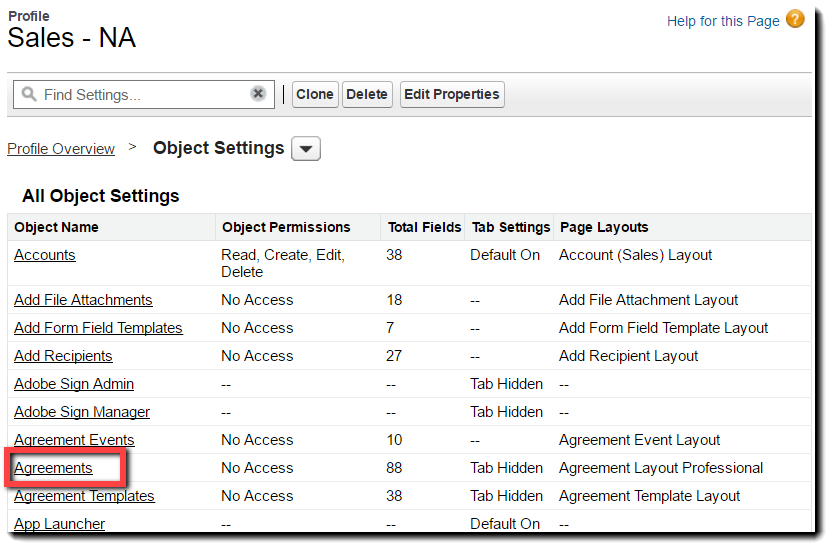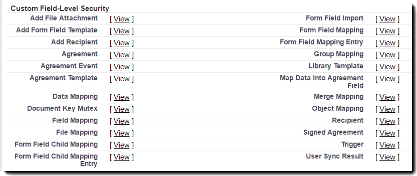 - Adobe Sign 관리 - Salesforce용 Adobe Sign 관리자 사용자에 대한 최소한의 필수 권한. 관리되는 패키지에 포함된 모든 구성 요소(개체, 필드, 탭, 클래스 및 페이지)에 대한 전체 액세스 권한을 포함합니다.