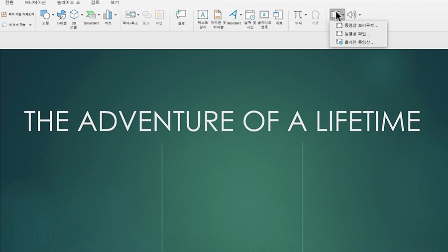 PowerPoint의 삽입 탭에서 동영상 > 동영상 파일을 선택하고 다운로드 폴더로 이동합니다.