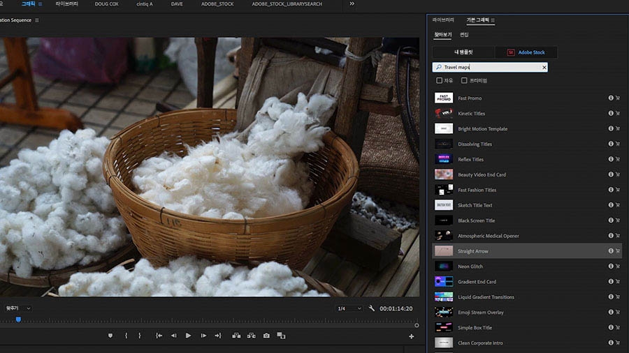 Premiere Pro의 기본 그래픽 패널에서 생동감 있는 세계 지도 템플릿을 검색합니다.