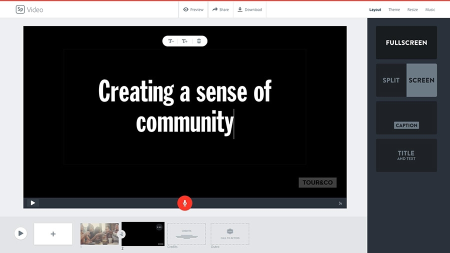 비디오 슬라이드 위에 있는 더하기 버튼을 클릭하여 비디오 위에 새 콘텐츠를 추가합니다. 텍스트를 새 개체로 선택하고 메시지를 입력합니다.