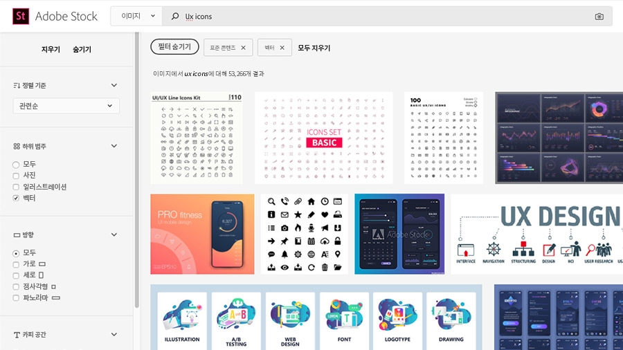 Adobe Stock에서 "UX icons"를 키워드로 검색하여 프로젝트에 맞게 편집 가능한 아트웍을 찾습니다.