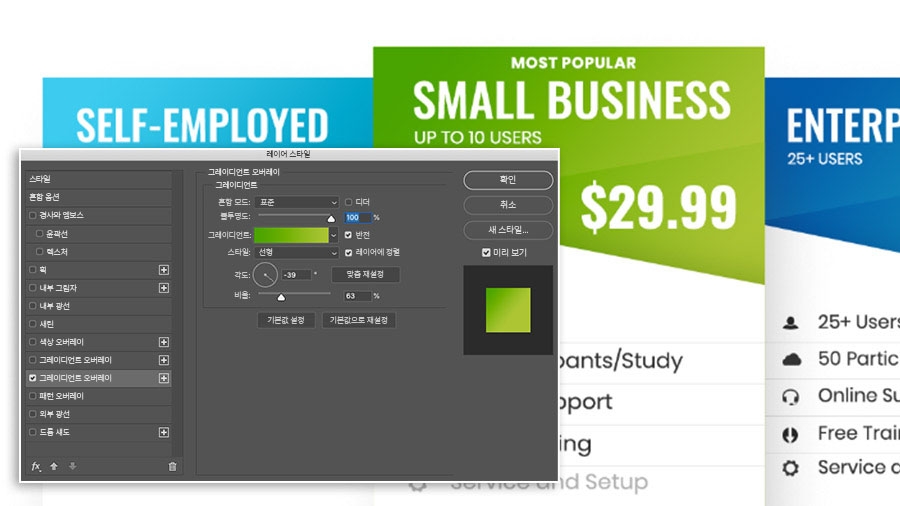 그레이디언트 오버레이 효과를 두 번 클릭하여 그레이디언트를 수정한 다음 정지점을 두 번 클릭하여 기업 웹 색상을 추가합니다.