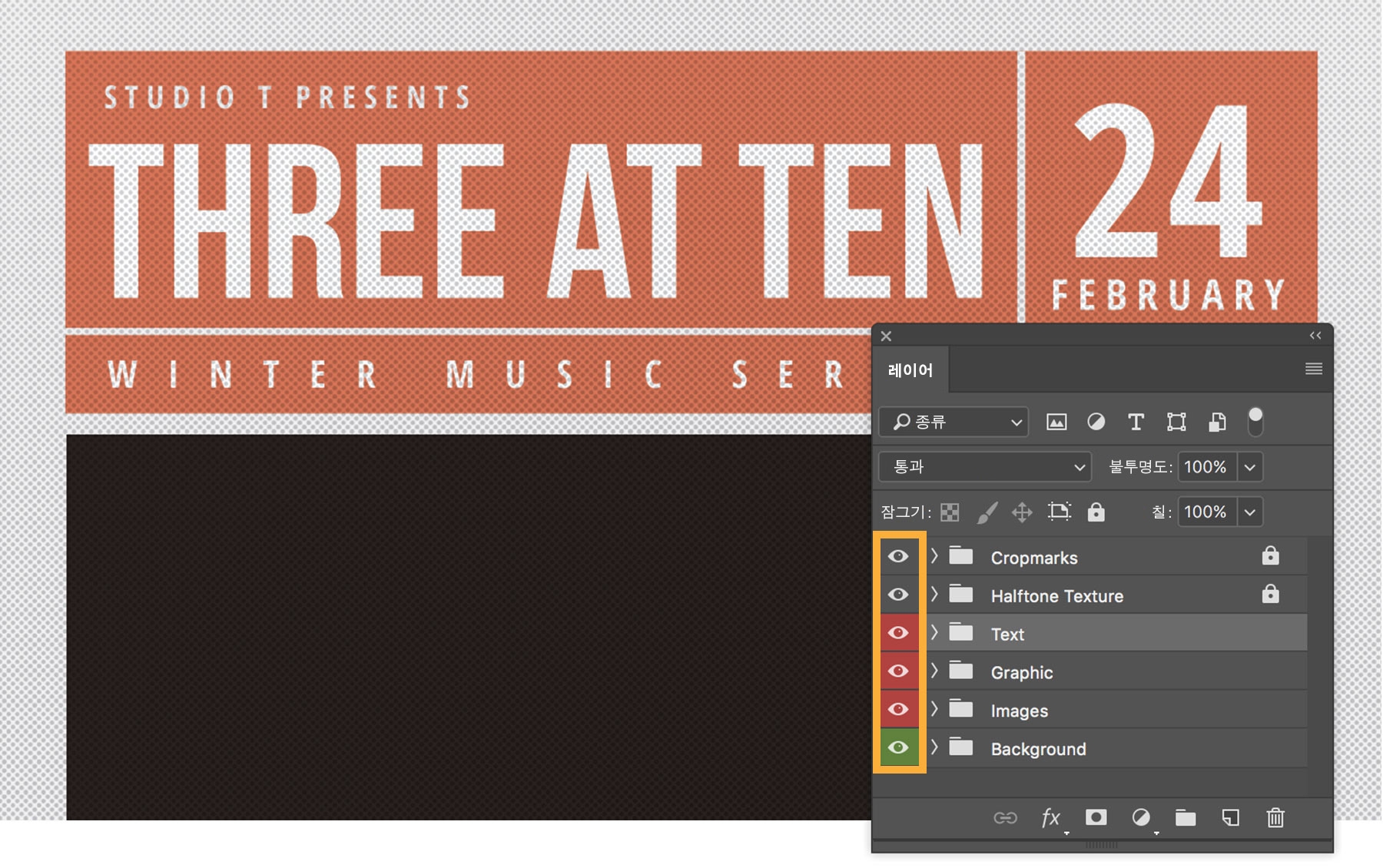 템플릿의 아트웍은 레이어를 기반으로 체계적으로 제작되어 있습니다. 레이어를 사용하면 개별 요소가 분리되어 있어 합성 사진의 다른 요소에 영향을 미치지 않고 편집할 수 있습니다. 창 > 레이어를 선택합니다. 레이어 패널에서 눈동자 아이콘을 클릭하면 레이어를 숨기거나 표시할 수 있어 템플릿의 구성 방식을 확인할 수 있습니다. 레이어를 모두 살펴본 다음에는 모든 레이어가 표시되도록 해야 합니다. 자세한 내용은 유연하고 제어 가능한 레이어 사용을 참조하십시오.