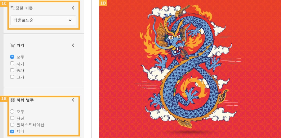 - 계절이나 명절과 관련된 인기 있는 주제를 찾습니다. 아래 드래곤 이미지(1D)는 많은 아시아 국가에서 검색하는 이미지로, 설날과 관련된 재미있는 예제입니다.