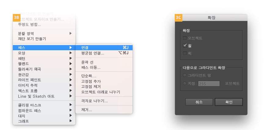 - 칠이 적용된 모든 모양 패스는 연결되어 있어야 합니다(3B).