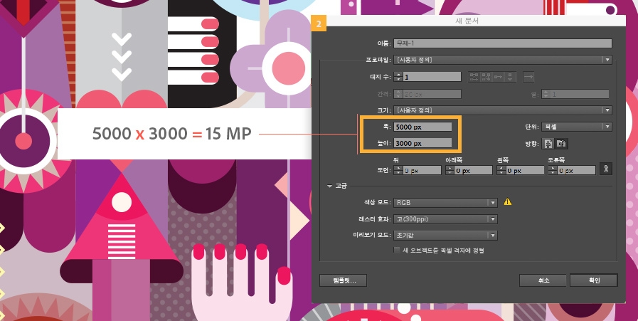 Adobe Stock에 제출하려면 대지의 크기(2)가 최소 15메가픽셀(MP)이어야 합니다. 대지의 크기를 확인하는 것은