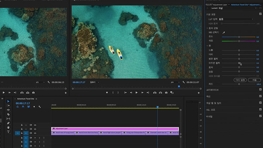 화면 오른쪽에 있는 Lumetri 창에서 각 클립을 프로젝트의 전체 느낌에 맞게 색상을 교정하고 균형을 조정할 수 있습니다.