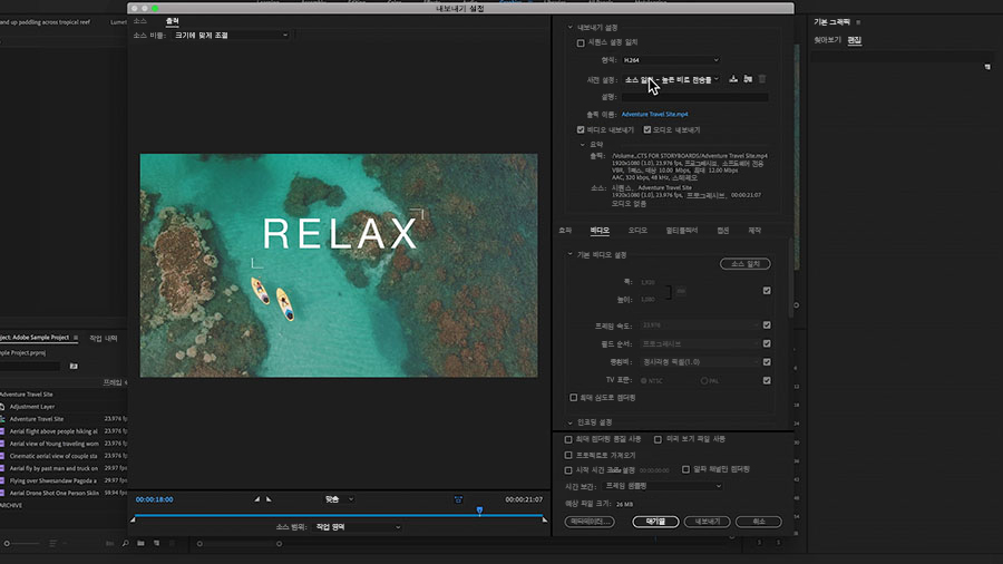 파일 > 내보내기 > 미디어를 선택하여 내보낼 시퀀스를 준비합니다.