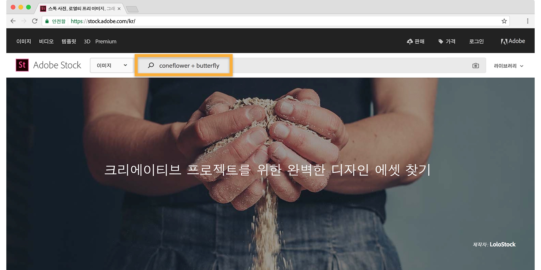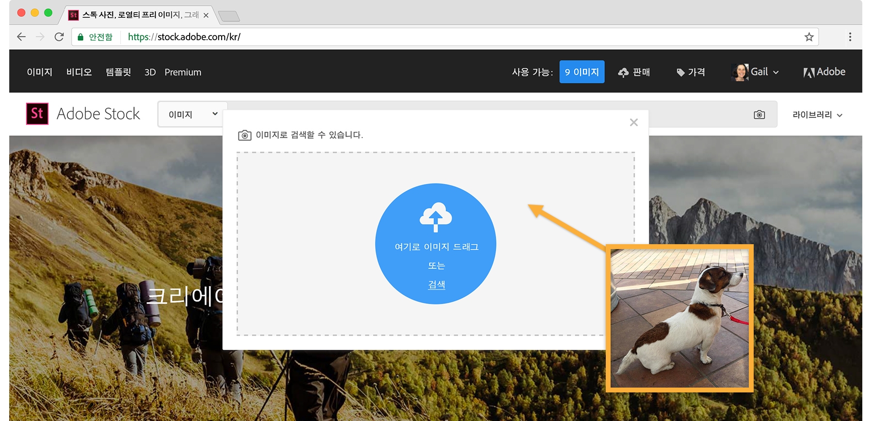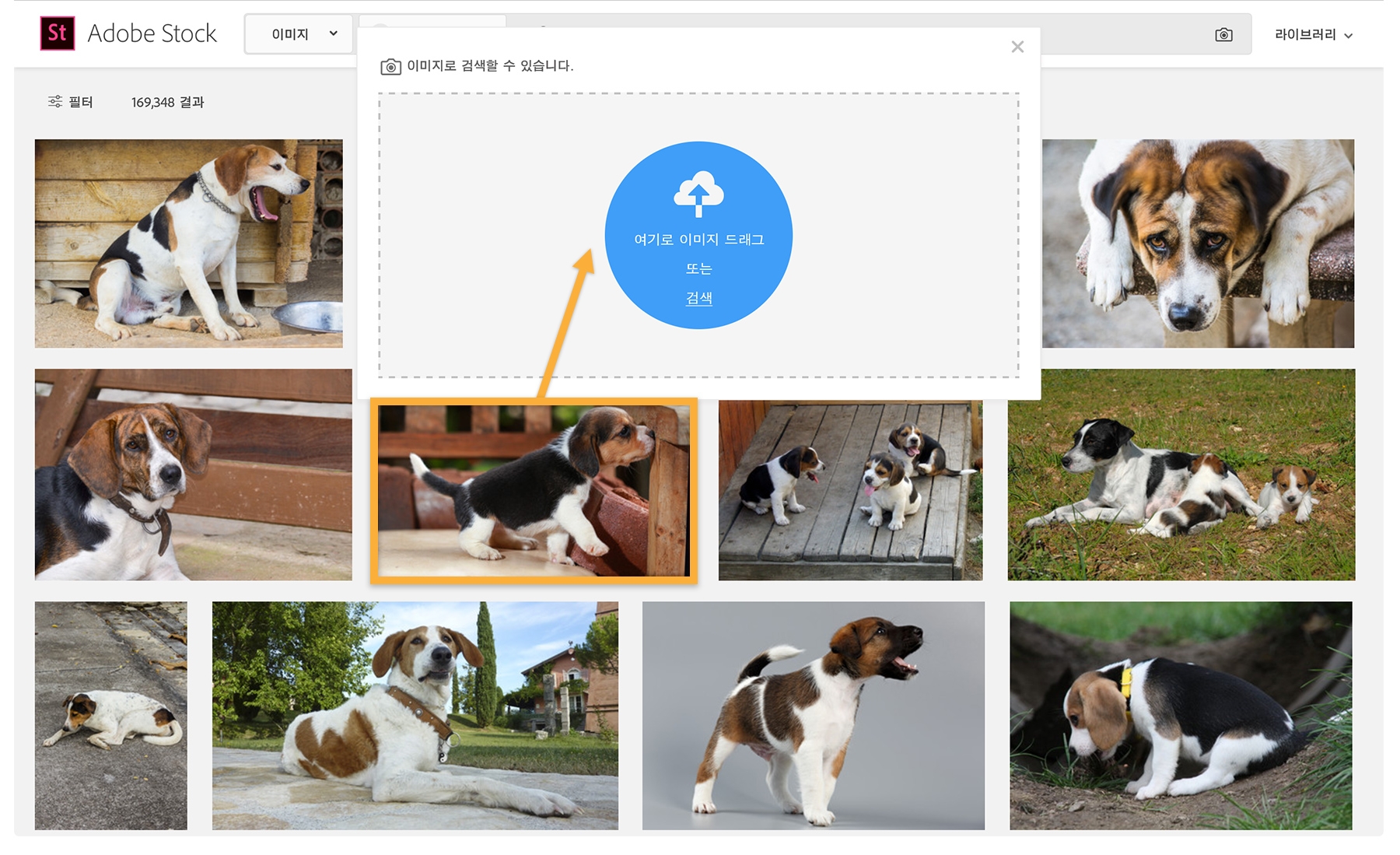 stock.adobe.com/kr에서 검색 필드에 있는 카메라 아이콘을 클릭하거나 JPEG 또는 PNG 포맷 이미지를 검색 상자로 드래그하면 됩니다. Adobe Stock은 해당 이미지를 분석하여 유사한 이미지를 브라우저 창에 표시합니다. 검색을 위해 업로드한 이미지가 저해상도라도 Adobe Stock은 고해상도 이미지를 찾아 표시합니다.