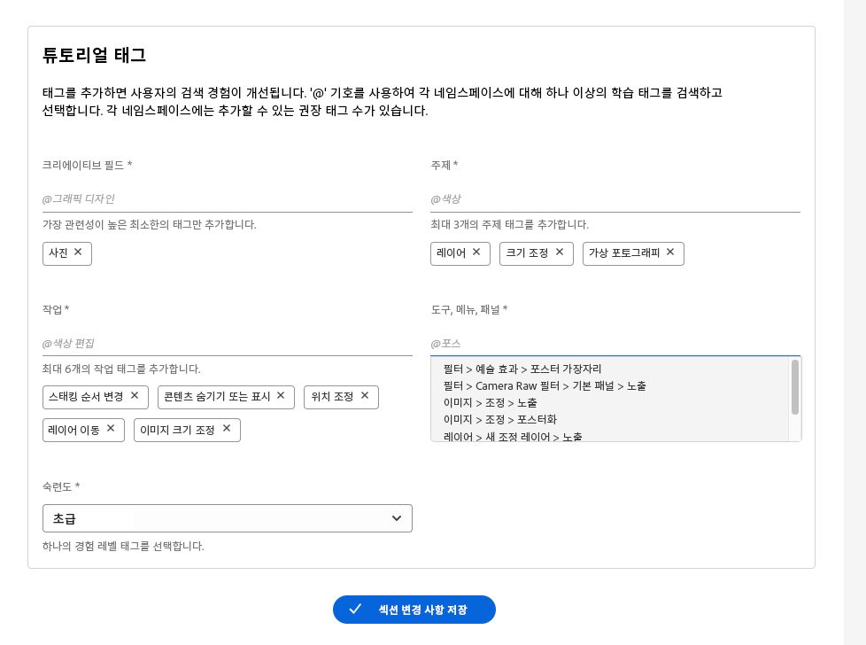 - 태그 지정의 의미와 튜토리얼에 추가할 범주 태그를 선택하는 방법을 알아보려면 태그 지정 가이드라인을 참조하세요.
