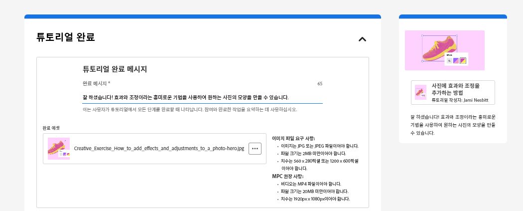 - 작성 가이드라인에서 튜토리얼 제목과 설명을 작성하는 방법에 대한 팁을 확인하세요.