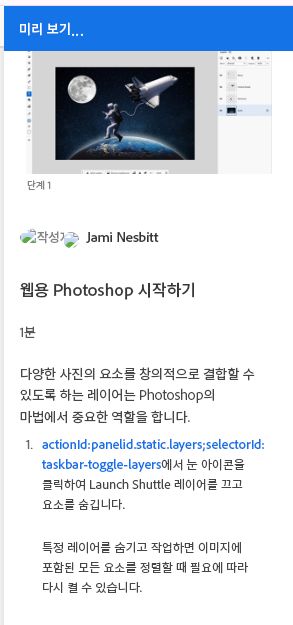 섹션과 단계를 만들 때 미리 보기 패널이 있더라도 제출하기 전에 앱에서 미리 보기를 선택하고 전체 튜토리얼을 살펴보세요.