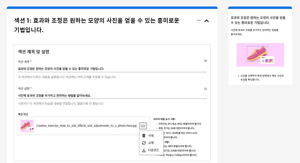 섹션 자산을 삭제하거나 교체할 수 있습니다.