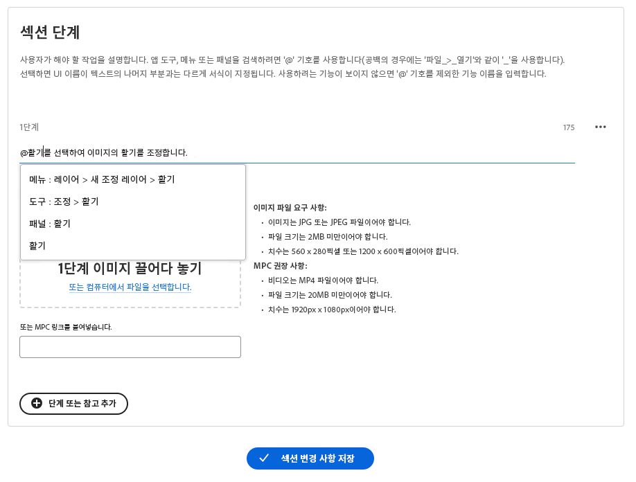 섹션 단계에서 "@" 기능을 사용하여 도구 또는 기능을 추가하면 튜토리얼 자체에서 코치마크로 표시됩니다.