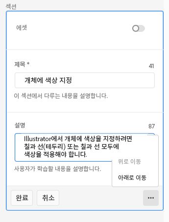 - 섹션: 튜토리얼은 여러 섹션으로 이루어져 있으며, 이는 연관된 단계를 그룹화하기 위한 구성 단위입니다.