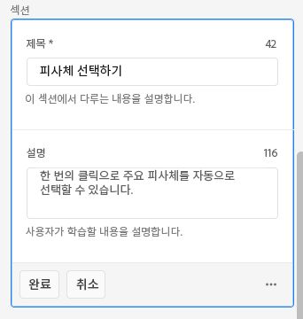 - 예: 입문자용 튜토리얼의 첫 번째 관문인 "텍스트 작업하기"의 섹션 제목은 "제목 추가하기"가 될 수 있습니다.