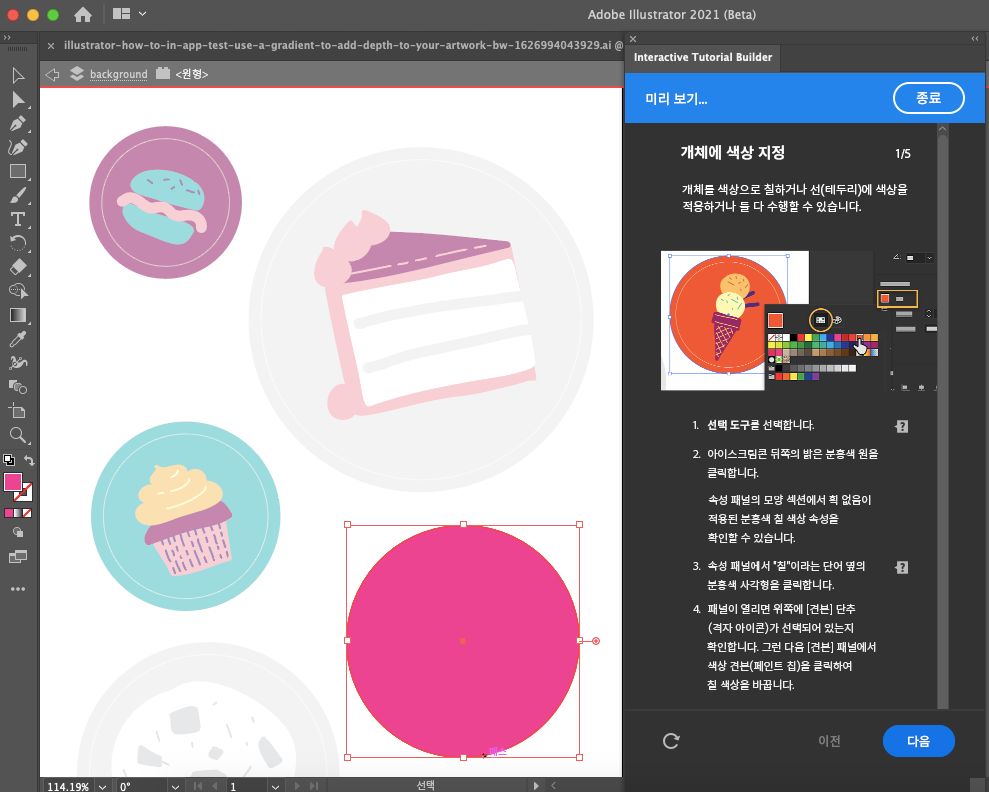 안내형 튜토리얼은 사용자가 컴퓨터에 설치된 Illustrator에서 따라 하며 학습할 수 있는 실습 튜토리얼입니다. 튜토리얼은 탐색 패널과 코치 마크로 구성됩니다.