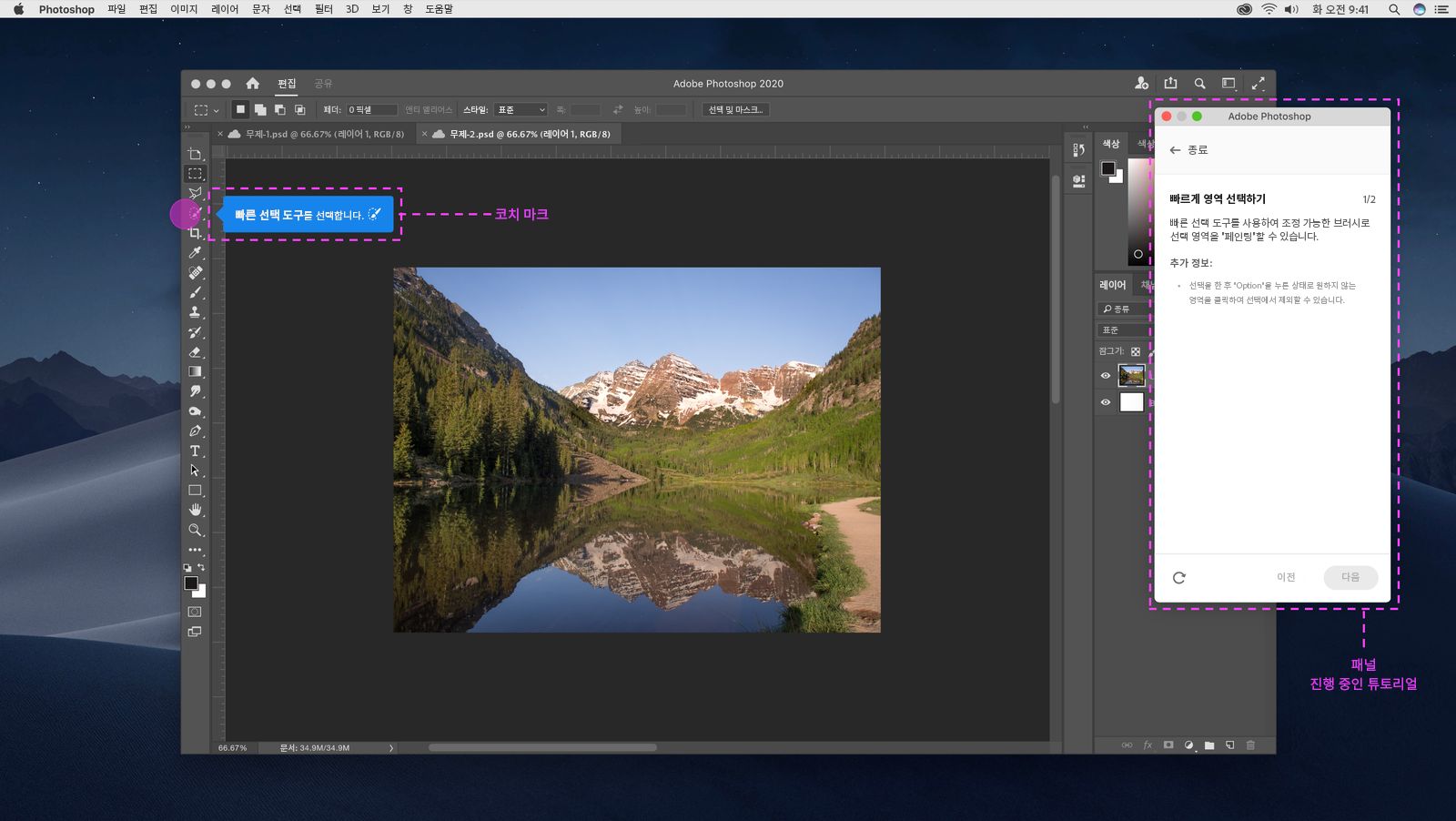 - 안내형 튜토리얼은 사용자가 컴퓨터에 설치된 Photoshop에서 따라 하며 학습할 수 있는 실습 튜토리얼입니다. 튜토리얼은 단계별 코치 마크와 탐색 패널로 구성됩니다.