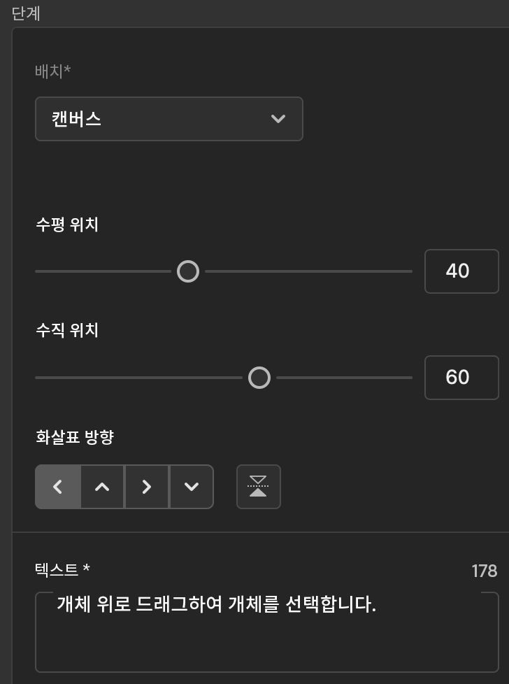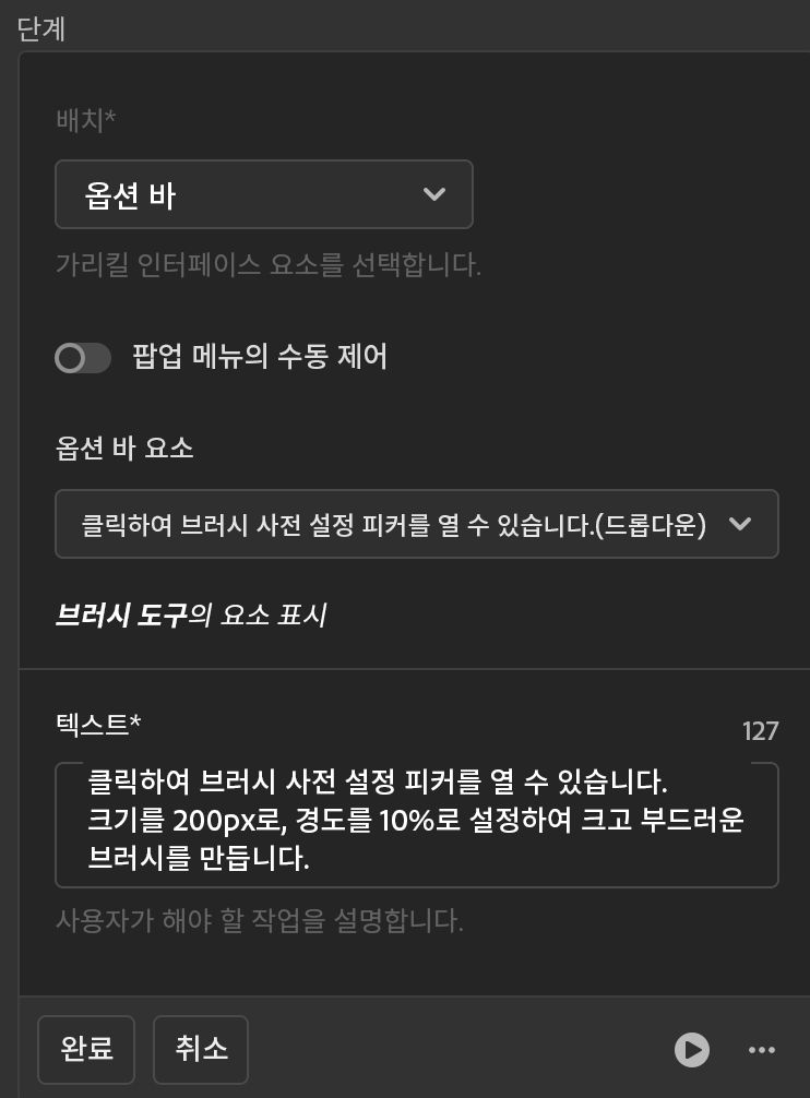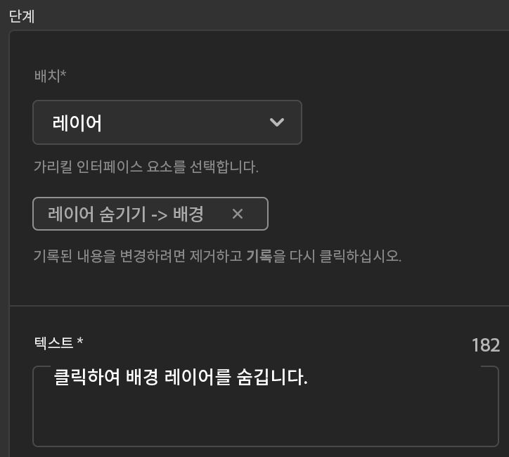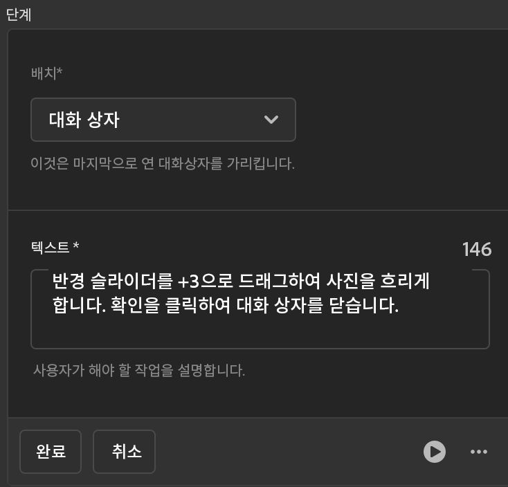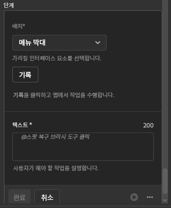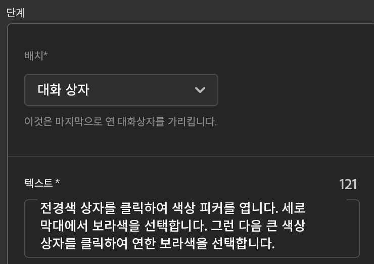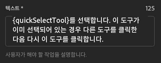- Tutorial Builder 문구 작성 가이드라인에서 설명 작성을 확인하세요.