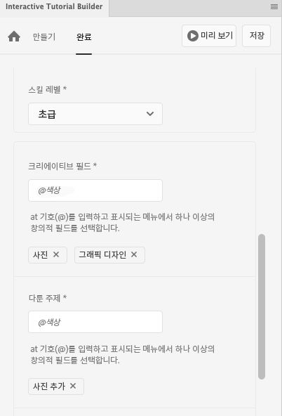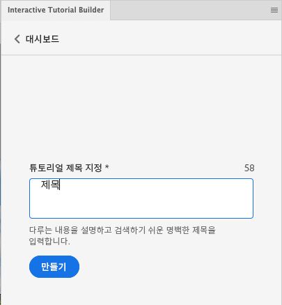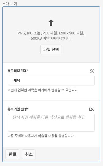 - 이전 화면에서 입력한 튜토리얼 제목을 변경할 수 있습니다. 그러나 사용자에게 보이는 제목만 변경할 수 있으며, 문서 식별자를 변경할 수 없습니다.