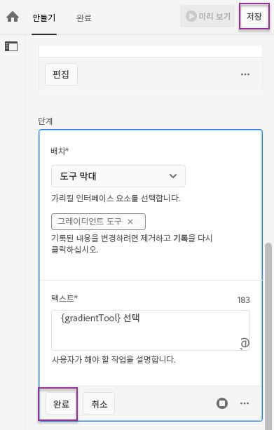 - 각 단계의 세부 정보 아래에 있는 완료 버튼과 Tutorial Builder 상단에 있는 저장 버튼을 모두 클릭합니다.