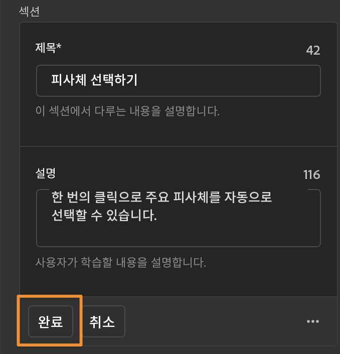 - 자세한 내용은 Tutorial Builder 문구 작성 가이드라인에서 제목 작성을 참조하세요.