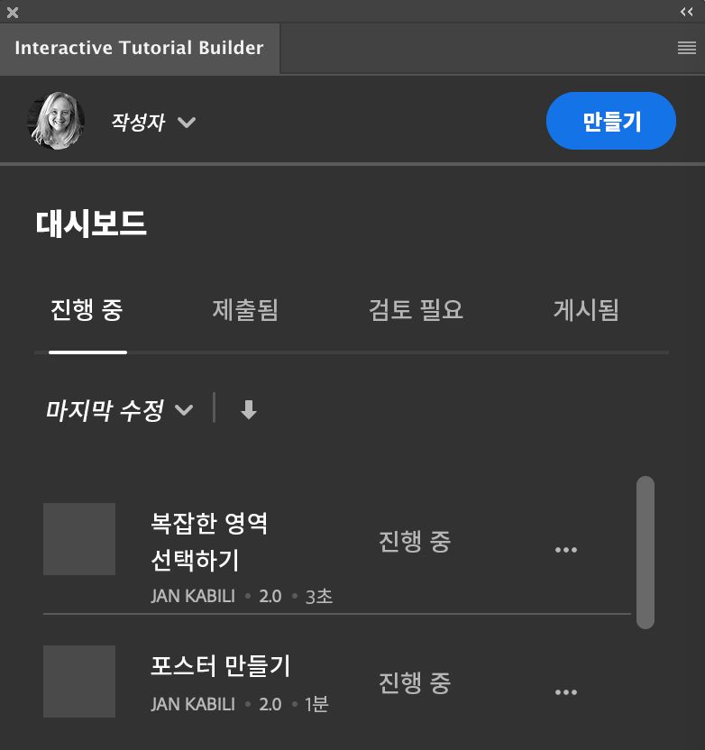 - Interactive Tutorial Builder 패널이 대시보드에 열리면 다음 상태별로 모든 튜토리얼을 확인할 수 있습니다.