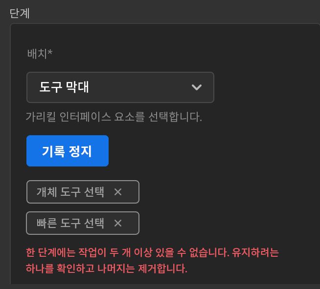 - 팁: 동일한 작업을 두 번 이상 기록한 경우(예: 동일한 도구를 실수로 두 번 이상 클릭한 경우), 해당 작업 중 하나를 제거하면 이 단계에 있는 동일한 작업의 모든 인스턴스가 제거됩니다.